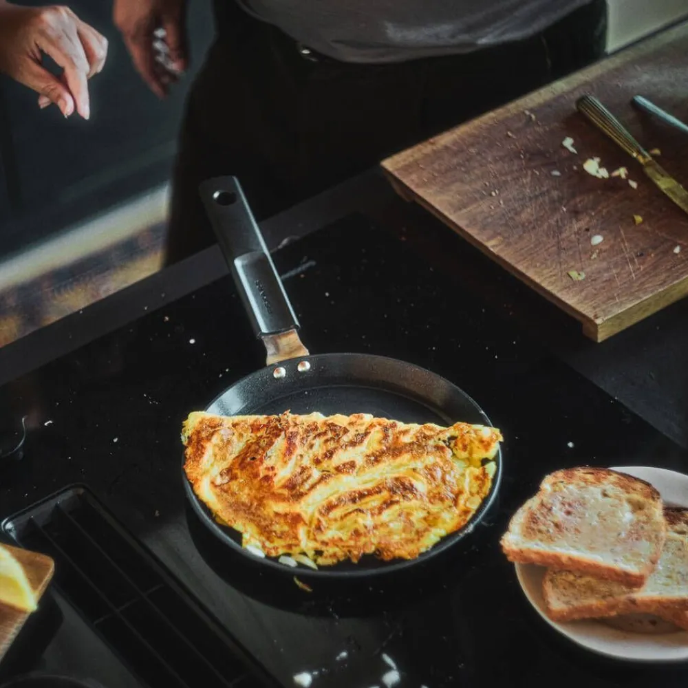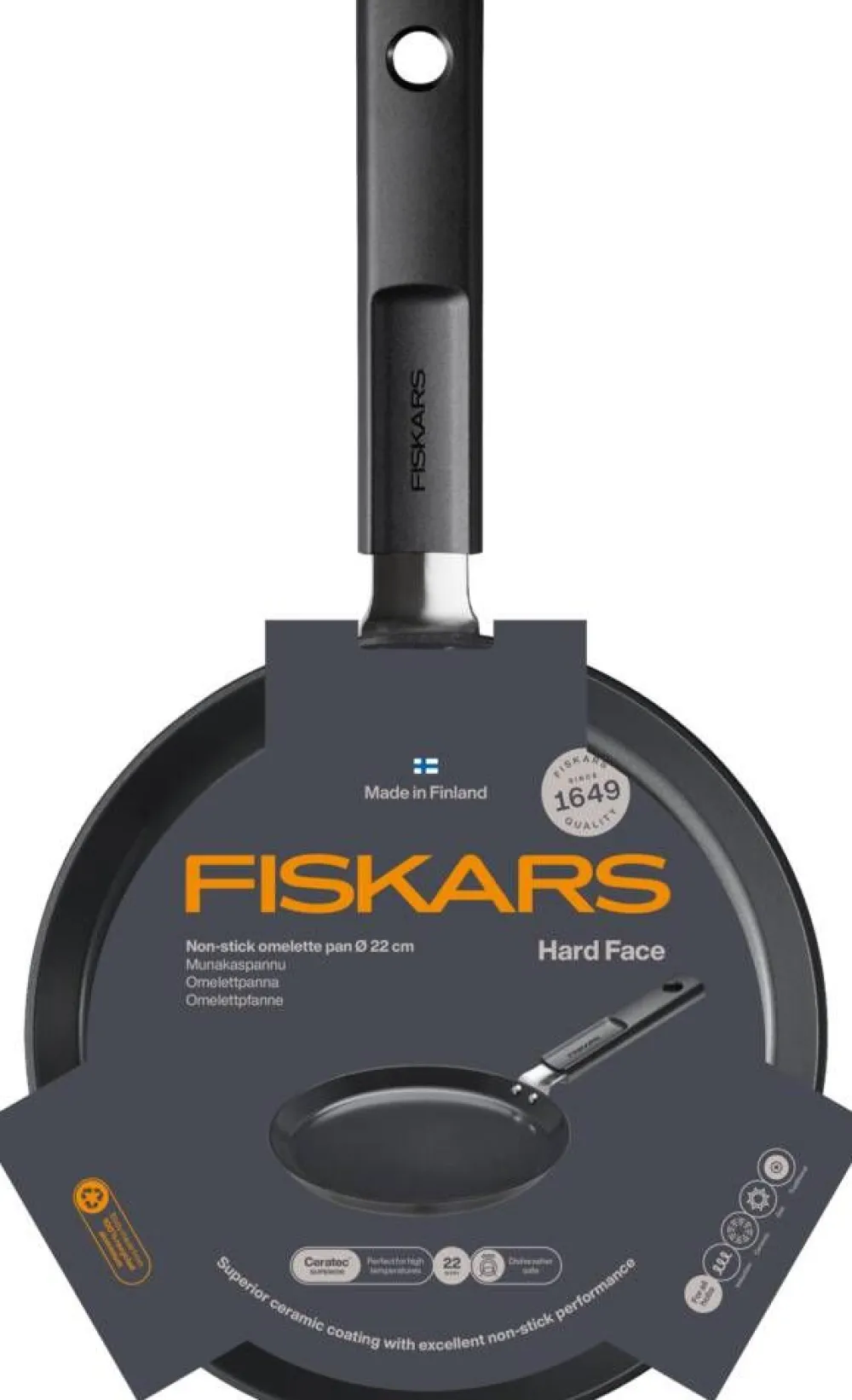 | Suomessa valmistettu Fiskars Hard Face 22 cm -omeletti/lettupannu muovittomalla ja tarttumattomalla pinnoitteella täyttää vaativankin kotikokin vaatimukset. |