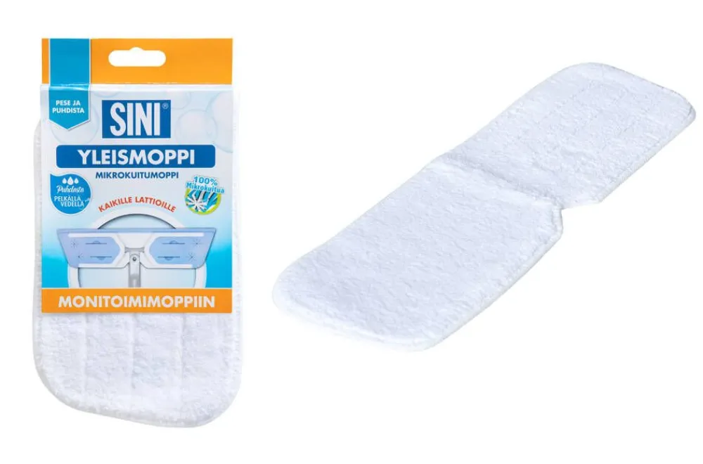 | Hoito-ohjeet:Puhdista moppi irtoroskista ja pölystä harjaamalla. Käytön jälkeen irrota moppi Monitoimimopin runko-osasta, huuhtele ja kuivata ilmavasti. Konepesu pesupussissa 60 asteessa. Kestää kymmeniä pesukertoja. Ei huuhtelu- tai valkaisuaineita. |