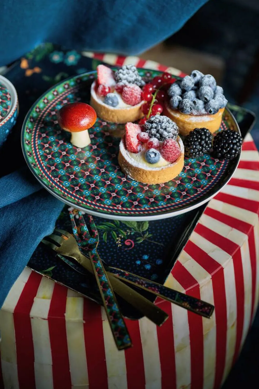 | Pip odottaa jo salaa pitkiä talvi-iltoja. Sellaisina iltoina hän kutsuu perheen ja ystävät illalliselle. Tätä tarkoitusta varten Pip suunnitteli Berry Blues -kokoelman. Tämän kokoelman tuotteissa on tummansininen kukkakuvio, jossa on oksia, joilla kasvaa elegantteja fantasian kukkia ja marjoja. Kukkakuvio yhdistyy syvään vihreään ruutukuvioon, jossa on punaisia aksentteja, jotka muistuttavat näistä tunnetuista talviruuduista. Reunat on viimeistelty kultaisilla yksityiskohdilla ja yllättävällä punavalkoisella raidalla, joka antaa kokoelmalle lämpimän ja kodikkaan tunnelman. Voimme sanoa, että Berry Blues -kokoelmamme on paras lääke talvibluesia vastaan. Tämä tuote ei sovellu astianpesukoneeseen, uuniin tai mikroaaltouuniin. |